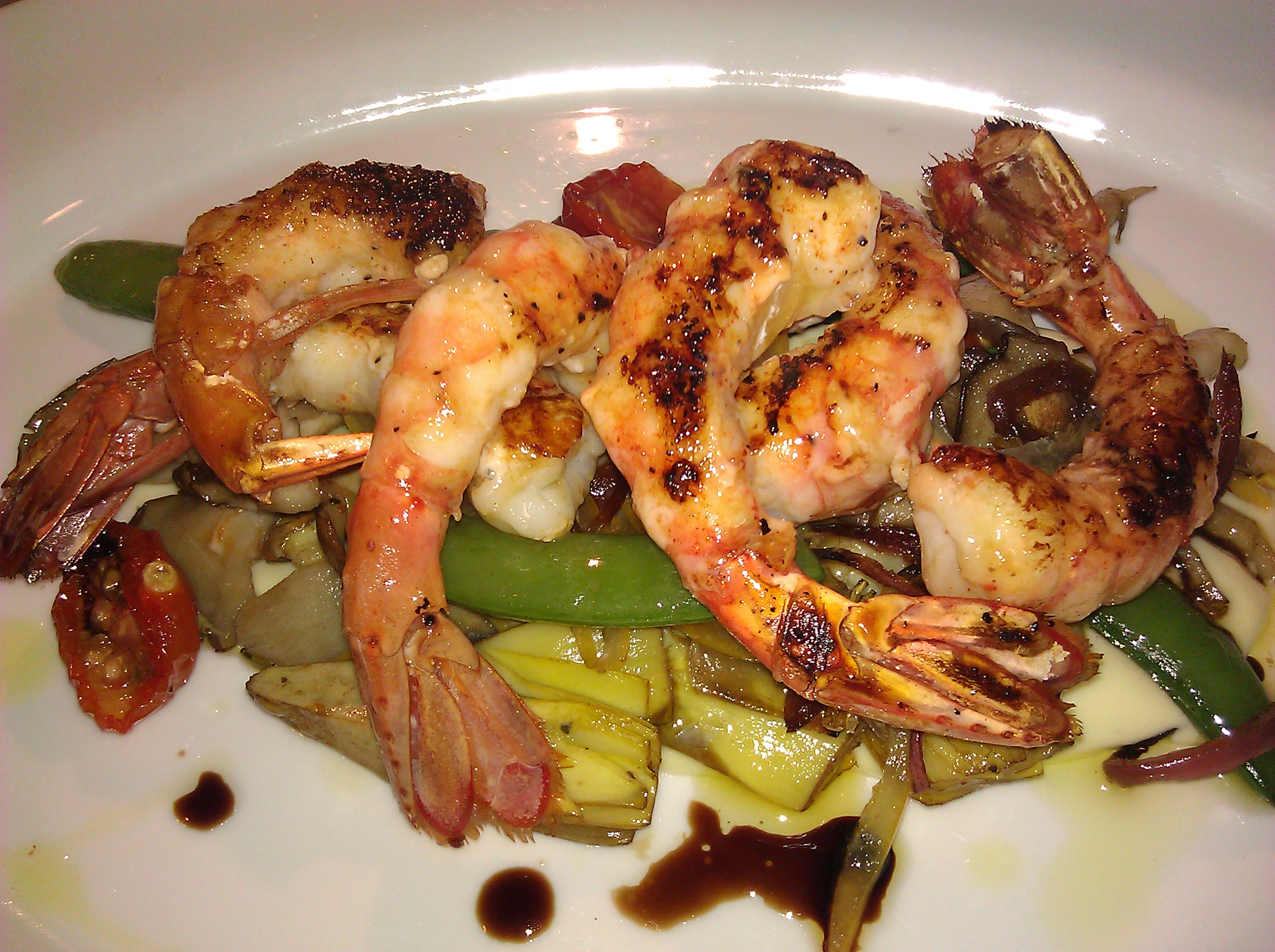 Alaskan shrimps, celery roots pure', and spring vegetables